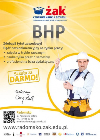 Przyjdź i zapisz się na bezpłatny kierunek TECHNIK BHP! Zdobądź solidne wykształcenie w 1,5 roku! Tylko u nas nauczysz się jak profesjonalnie przeprowadzać kontrolę zasad i przepisów BHP w zakładzie pracy, sporządzać okresowe analizy BHP, przygotować wnioski dotyczące poprawy stanu BHP oraz dokonywać oceny ryzyka zawodowego.